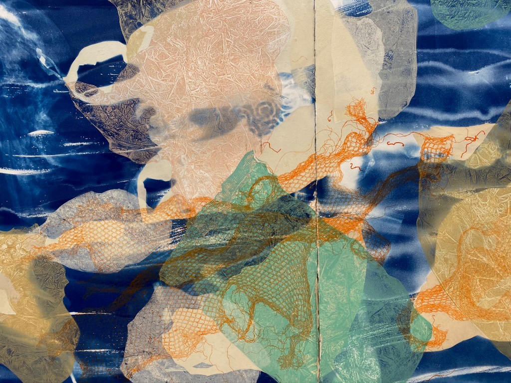 Elizabeth Ransom: In your practice, you combine the historical photographic process of cyanotypes with screen prints, monoprints, relief prints, and paintings. Can you tell us a little bit about these processes and what inspired you to use these techniques in your work?