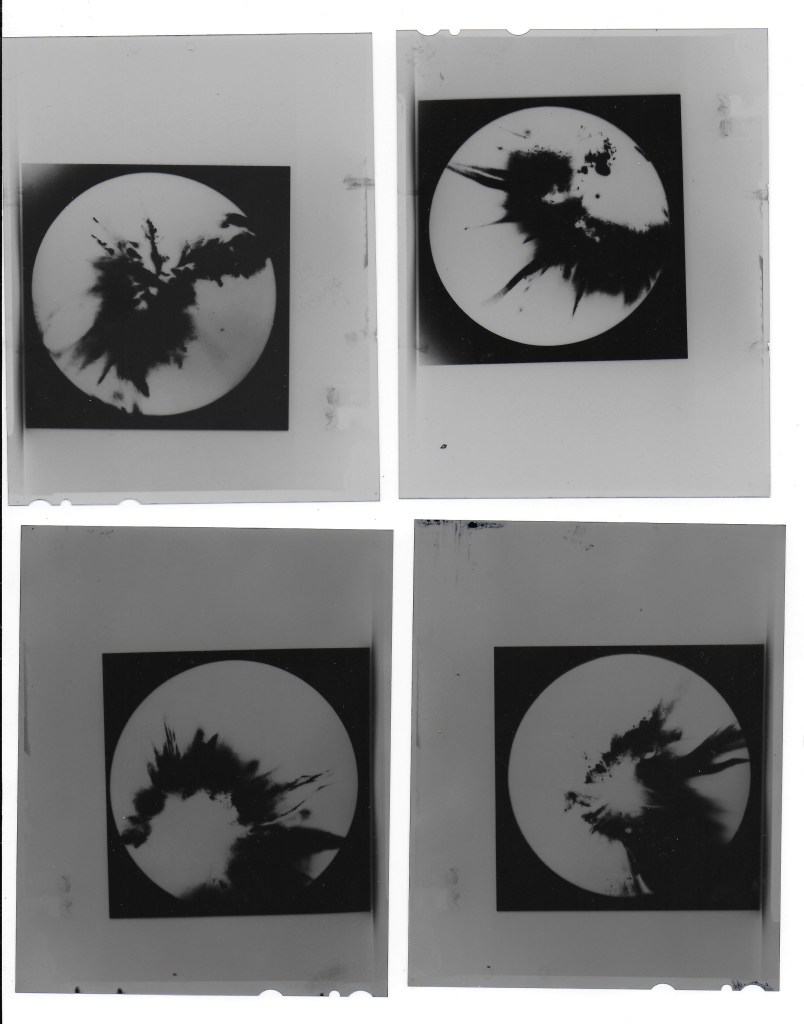 I used expired Foton Unibrom paper, experimented with different varnishes and tried various methods to splash and pour chemicals onto the paper until achieving a desired result. Afterwards, I re-photographed the chemigrams, digitally added a circular frame, projected the image on a wall, and re-photographed them once more using 4×5 film. This process allowed me to capture the proper black and white tones and achieve functional negatives which I’m planning to print on top of aluminium sheets in the future.