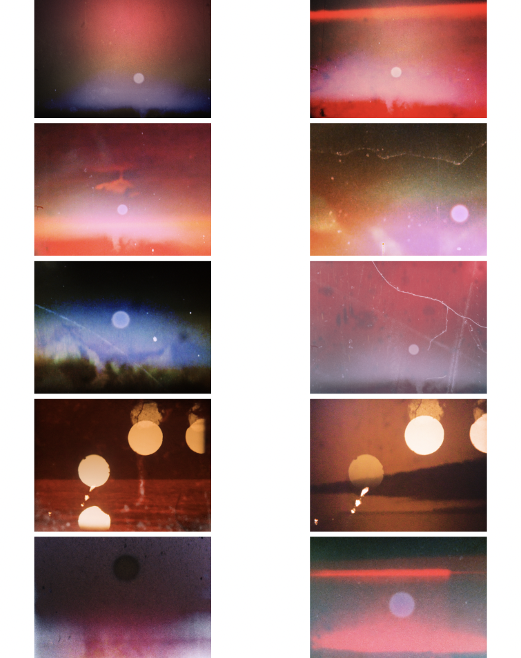 Sapphire Goss: I began using expired film for reasons of economy – first in 35mm/120 and later with 8mm/16mm. Fresh stock is increasingly expensive, and I prefer feeling free to experiment and make mistakes rather than being too precious, especially when I am learning new processes. And of course the flip side to this is you get very unpredictable but often beautiful results – colour shifts, emulsion flaws, grain, and sometimes even other people’s forgotten photos coming through. There is something quite compelling about unearthing these objects that have been forgotten – exposing light onto them through the layers of chemicals and materials that were assembled many years ago, before I was born. Some were made in a wholly different world from today – the USSR still existed for example. It might be overly romantic but I feel that these objects are imbued with their own traces of time or memories, and by bringing the objects back to life these properties are unearthed. I like that they make everything look moody and evocative, and the material properties blend into the imagery. In Compound Horizons I leaned into this a lot, using sprocket holes and the edge of the frames as landscapes in their own right. I’m really into that sense of pareidolia – which is where you see shapes in clouds and the like, images slowly emerging from grain and matter. The edges of the film reels make horizons, holes are suns or moons, static/grain bleeds into light on water into stars, chemical forms into clouds – exploring and shaping the terrain of the celluloid. I am really influenced by Pavel Filinov, a Russian painter from the early 20th Century. He’s only had a handful of international exhibitions but I was lucky enough to see an exhibition of his in St Petersburg in around 2006. It was incredibly beautiful, the room was in darkness with the paintings lit up, and they seemed to breathe and move. He talks about this idea of ‘universal flowering’ where everything had to come from the cellular to its creation, and I am aiming for a similar type of process whereby the artwork grows from its form but also its elements/chemicals/light particles like a plant – growing, alive, scaling up and down from the molecular to the cosmic.