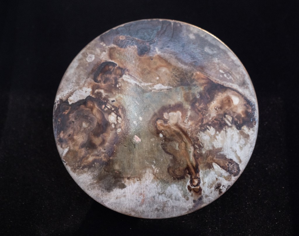 Optographic Objects: Copper Chemigrams, Silver extracted from photographic fixer on copper sheets, wood, 2022-23