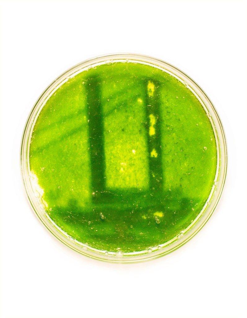 Kari Varner: After making the photographs in 2018, I dabbled with some ideas but couldn’t find a suitable format in which to show the work. Finally, in 2021 I had the idea of growing the images in algae and therefore tying the materiality and process of making into the subject of the project itself. After finding the astounding work of French artist Lia Giraud and her creation of the algaegraph, I knew that the process was possible. Using the microalgae chlorella vulgaris, I conducted many experiments with types of nutrients, using an enlarger vs a light table and generally working to identify suitable growing conditions for the algae to thrive. The photographs take a week to emerge and require the pipetting of nutrients into the Petri dish. I was living in Florence, Italy at the time, a much more humid environment and have now moved to a cooler and drier climate. This has required me to recalibrate the algae growing process. I do consider the work ongoing, with the next stage focusing on the photographs of the waterways, which are more abstract and therefore more technically demanding in the kind of “resolution” needed to achieve a readable image. Once the photographs have been grown, the resulting image is scanned and photographed. The photograph is then printed while the algae itself dries and the photograph begins to fade. I have explored possibilities of creating a time-lapse of the growth or bringing the growing process into an exhibition space but for now the work is presented as a document instead.
