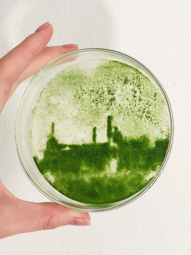 Throughout the US some chicken plants and other agricultural organizations are dumping waste materials that are rich in nitrogen and phosphorus directly into nearby waterways. This causes the degradation of local ecosystems. Motivated by the negative environmental impact on these vulnerable environments, American artist Kari Varner creates images of these locations using a unique process of growing algae. Each image can take up to a week to emerge and involves a great deal of care and labor to create. Kari hopes that by drawing attention to these environmental issues within her creative practice it will encourage others to reflect on the environments they care for too.