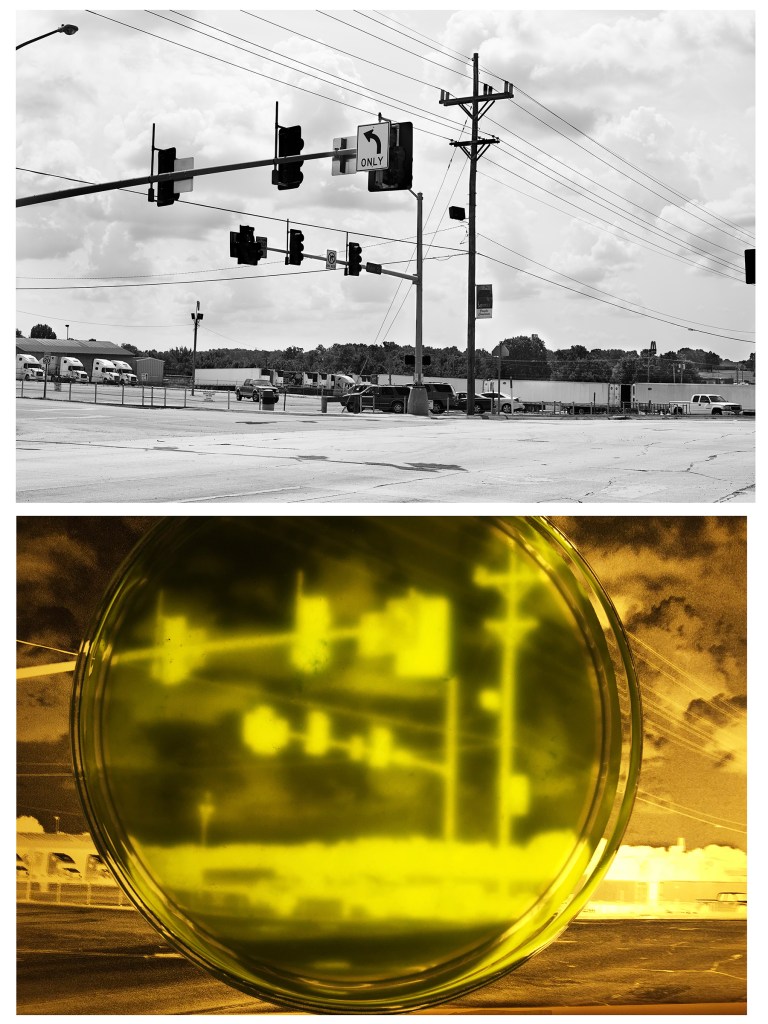 Elizabeth Ransom: In your body of work Monett & Sedalia you create images of Tyson chicken plants. As with many of your works this piece is driven by engagements with place and location, in particular this piece was created near the waterways of Monett and Sedalia that surround the poultry plants in rural Missouri. These two locations have been the site of past environmental disasters. Can you tell us a little bit about why you selected this site and what is happening in this area that is contributing to algal blooms and dead zones in the Gulf of Mexico?