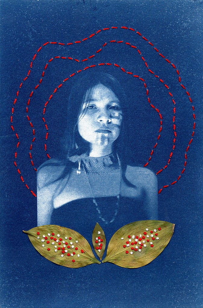 Tatiana Lopez: Symbolism is a significant part of this project. I wanted to visually portray that act of destruction and re-construction of new narratives through photo-embroidery and cyanotypes. The process of creating the cyanotypes is very meaningful and connects to the elements Sapara women considered important to maintain a witsa ikichanu, “good living.” These elements were the water that washed the prints, the wind that dried the prints and the natural leaves and feathers collected to embroider and create impressions onto the cyanotypes.