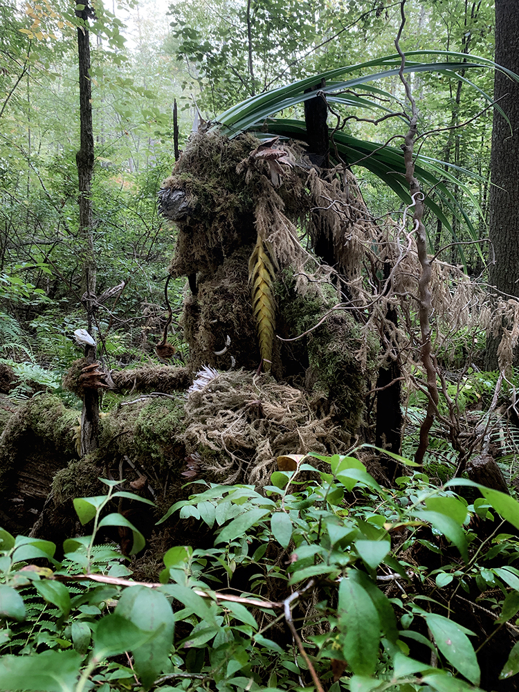 I enjoy the construction, being outdoors, and the challenge of installing in different terrains. Each of my large monsters has a jointed body that can be positioned in expressive ways. Often site-specific, the materials themselves suggest the particular nature and personality of each one. On any given day, I might be making several hundred porcelain teeth, covering bones in soft willow catkins or crushed velvet flocking, or draping ten-foot armatures in 120 cubic feet of moss.