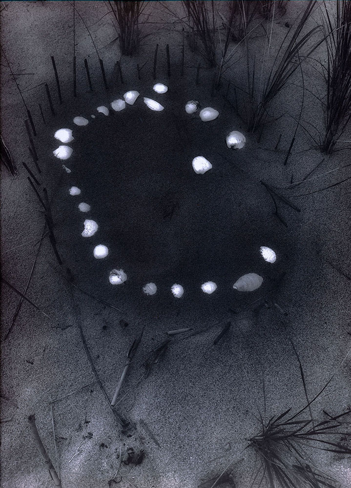 Anne Eder: Every ecological system has its own stories to tell and presents a distinct materiality to draw from. For example, as you mentioned, Sanctuary and Abjuration was mossy and plant-based, but Mysteries of Plum Island is set in an entirely different environment. The sandy textures and tessellations, the inhospitable climate, and the rhythm of the ocean demand a different expression. For that series, I used seawater to create salted silver prints, connecting them directly to the site by soaking my paper in the ocean. This met my requirement of relating to the site in a tangible way and introduced an element of the primordial, the inexorable. The sea as ancient and salty, the prints made using a salty and simple method. Impurities in the seawater also contributed to imperfections and tonal variations. Walking in Fox Talbot’s steps, I felt deeply connected to the medium of photography.