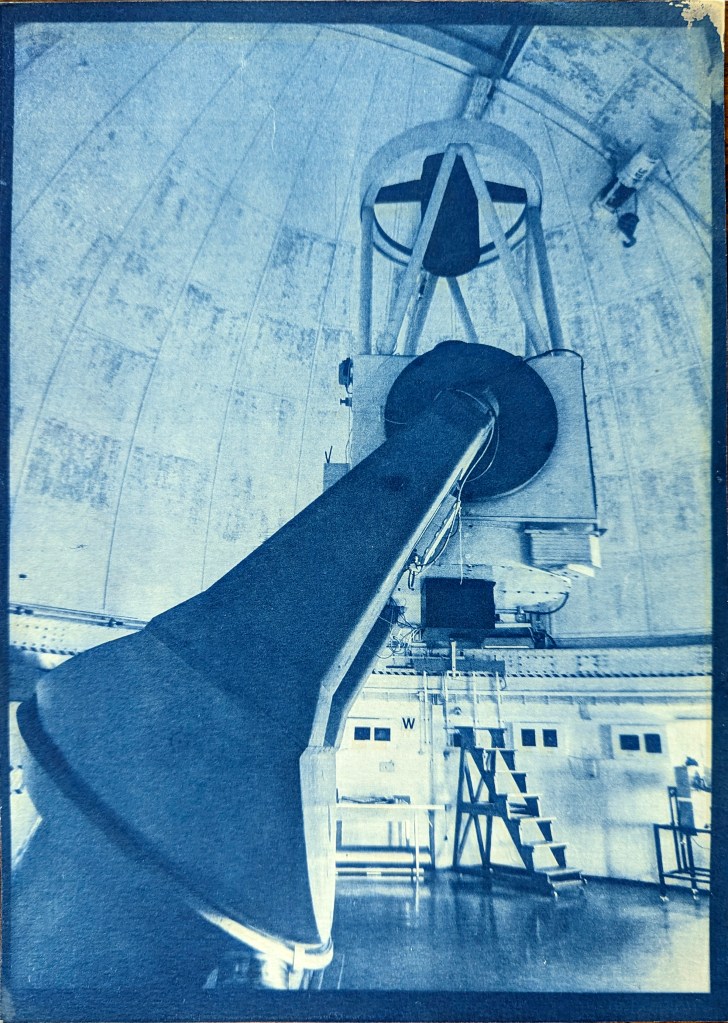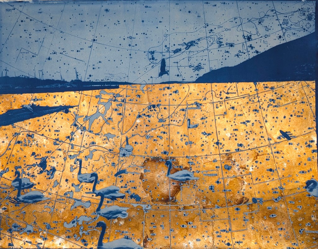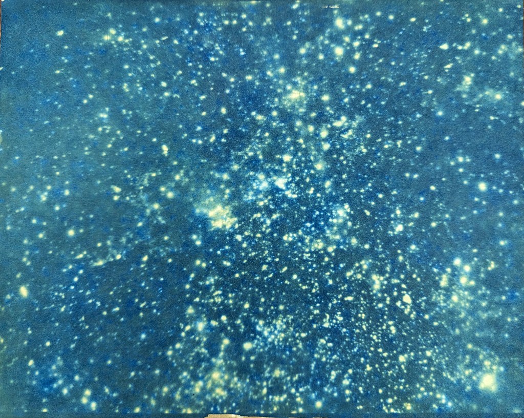 One of the source materials for Nidhi Khurana’s body of work Blueprints of Another Time is one of the most used astronomical atlases of the sky, the Atlas Coeli Skalnate Peso. This celestial map was created by Dr. Antonín Bečvář who documented “all stars brighter that 7.75 magnitude” (Kresak 1983, 147) in 16 large maps. Khurana combines these maps of the night sky with the cyanotype process and gold leaf. These images explore themes of place, time and memory. Through layering of the multiple techniques she investigates how one locates themselves and how individually we define place.