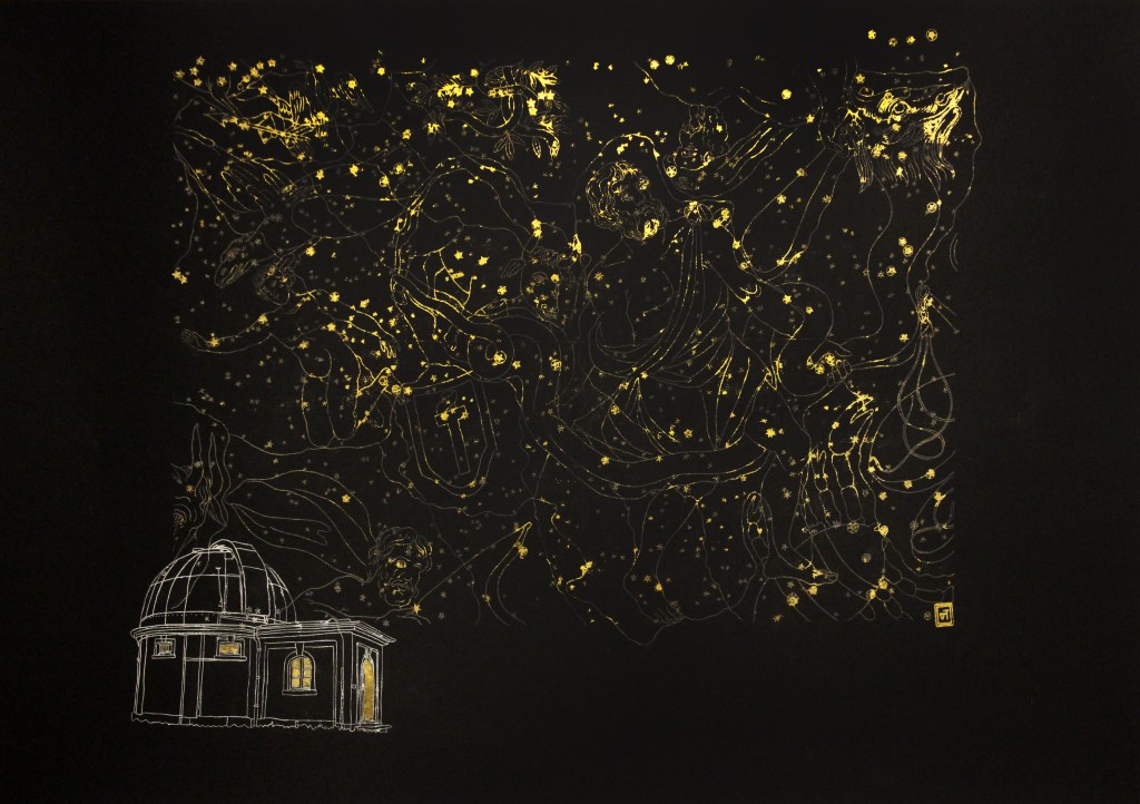 I was in Hamburg, Germany in 2022 for an artist residency program and I found myself at the Hamburger Sternwarte (Observatory) in Bergedorf, looking through a telescope on a clear night in October. I was able to access the atlases of Bode and Bayer from the seventeenth century in the library of the observatory. These maps, created by scientists observing the night sky for years and years lie forgotten in vaults, very much like the view of the stars in the night sky that we hardly witness today. I wanted to bring back this memory of the stars, embedded in our DNA into wider circulation, to remind us that we are nothing but stardust.
